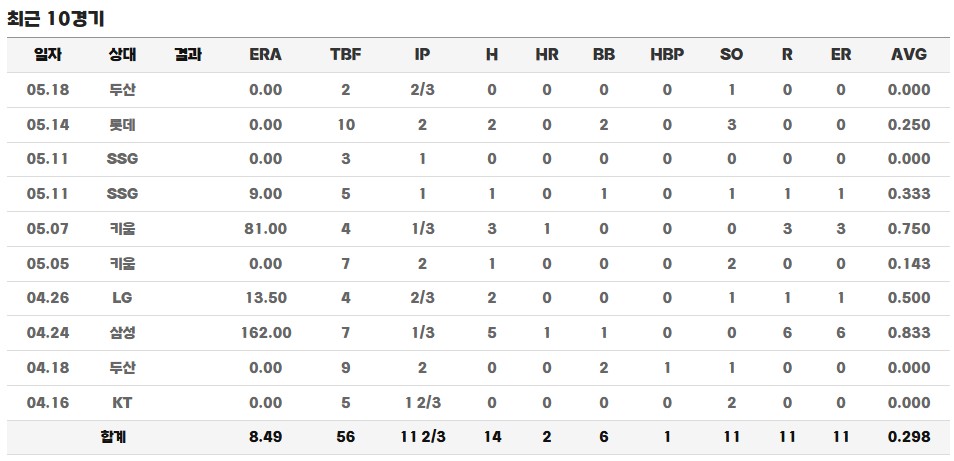 하지만 4월 24일 삼성전에서는 ⅓이닝 6실점이라는 충격적인 부진을 보였고, 4월 26일 LG전에서도 ⅔이닝 1실점을 기록하며 아쉬움을 남겼습니다. 이후 5월 5일 키움전에서는 2이닝 무실점, 5월 7일 같은 팀과의 경기에서는 ⅓이닝 3실점으로 기복 있는 모습을 보여주었습니다.