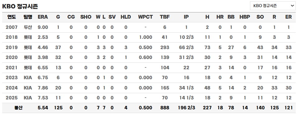 2025시즌은 퓨처스리그에서 출발했지만 4월 4일 1군에 콜업되며 다시 기회를 잡았습니다. 이후 여러 경기에서 롱릴리프로 등판하며 인상적인 모습을 보여주기도 했습니다. 4월 11일 SSG전에서는 2⅔이닝 1실점, 4월 16일 kt전에서는 1⅔이닝 무실점으로 호투했습니다. 4월 18일 두산전에서도 2이닝 무실점을 기록하며 좋은 흐름을 이어갔습니다.