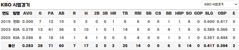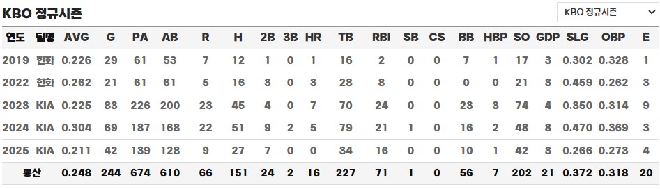 2025년 시즌에는 7월 기준으로 1군에서 42경기에 출전해 타율 0.211, 27안타, 16타점을 기록하며 다소 아쉬운 성적을 보이고 있습니다. 아직 홈런은 기록하지 못하고 있지만, 2군에서는 4홈런과 0.309의 타율을 기록하고 있어 1군에서도 보다 안정적인 성적과 장타력이 요구되는 상황입니다.