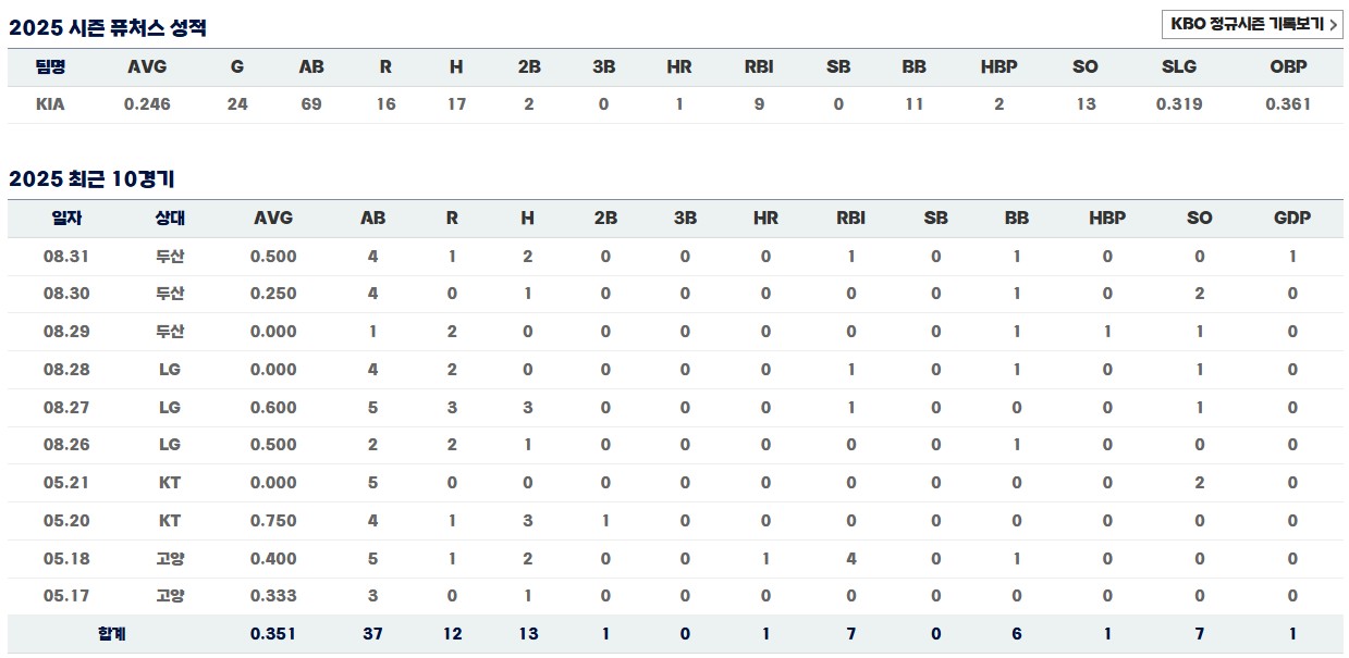 2025년 9월 현재 윤도현 선수는 퓨처스리그에서 타율 0.246(24경기), 1군에서는 타율 0.288(20경기)을 기록 중입니다. 수차례의 부상과 재활로 인해 많은 경기를 소화하지는 못했지만, 1군에서 보여준 강한 임팩트는 분명한 가능성을 증명한 셈입니다. 팬들은 그가 시즌 막판 KIA 타이거즈의 순위 경쟁에서 중요한 역할을 해줄 것으로 기대하고 있습니다.