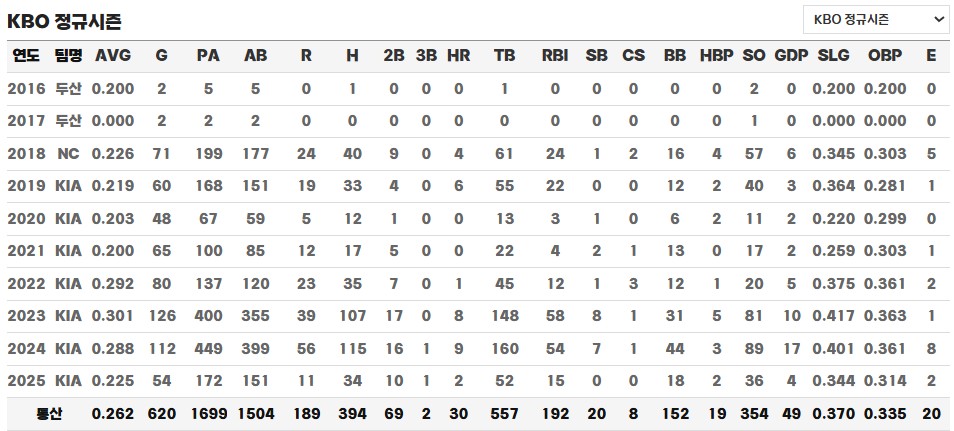 2025년에는 현재까지 54경기에 나서 172타석, 34안타, 2홈런, 15타점을 기록하며 타율 0.225에 머물러 있습니다. 안정적인 컨택과 선구안을 기반으로 팀에 꾸준히 기여하고 있으나, 여전히 더 큰 분발이 필요한 시점입니다.
