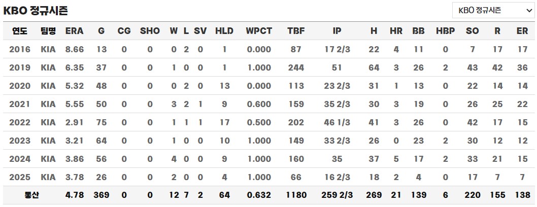 2025년 시즌, 이준영은 KIA 타이거즈에서 중간계투로 26경기에 출전해 16⅔이닝을 소화하며 2승 4홀드, 평균자책점 3.78을 기록하고 있습니다. 불펜진에 좌완 자원이 부족한 상황 속에서 꾸준한 활약을 이어가고 있으며, 시즌 중반 현재까지 안정적인 모습으로 팀에 힘을 보태고 있습니다. 경기마다 중요한 순간에 등판해 팀을 구해내는 모습은 그가 단순한 ‘왼손 원포인트’ 이상의 가치를 지닌 선수로 성장했음을 보여줍니다.