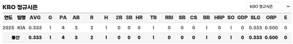 2025년 시즌에는 외야수로 포지션을 확정하고 다시 도전에 나섰습니다. 젊은 외야 자원이 부족한 KIA의 상황 속에서 박재현, 김석환과 함께 주목받는 외야 유망주로 평가되었고, 5월 5일 드디어 정식 선수 전환과 함께 1군 콜업이 이루어졌습니다. 콜업 전 퓨처스리그 성적은 22경기 81타수 27안타, 2홈런, 타율 .333, 출루율 .421, 장타율 .482로 OPS 0.902를 기록하며 1군 진입을 예고했고, 이날 키움과의 고척 원정 경기에서 8번 타자 우익수로 선발 출전해 3타수 1안타 1볼넷 1득점으로 성공적인 1군 데뷔전을 치렀습니다.