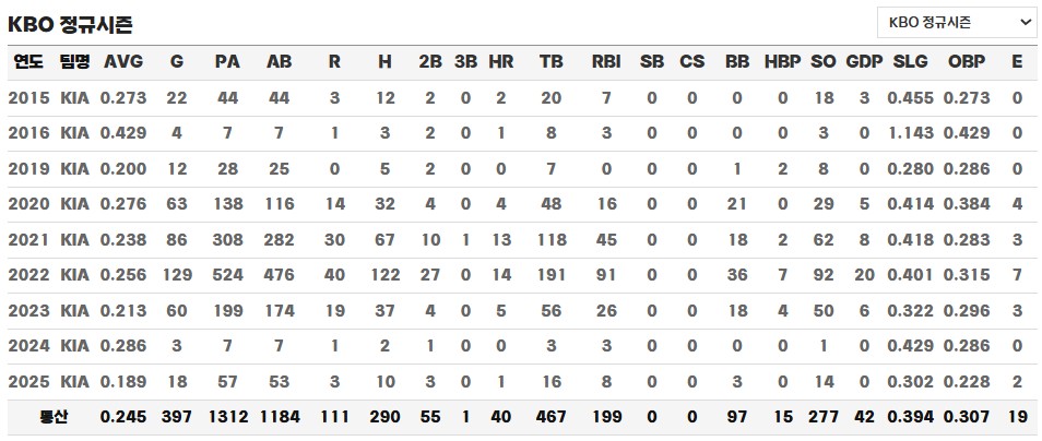 2025년 시즌에도 부진은 계속되고 있습니다. 현재까지 18경기에 출전해 57타석에서 단 10안타, 1홈런, 타율 0.189로 극심한 부진을 겪고 있습니다. 시즌이 이대로 마무리된다면 내년 시즌 1군 기회를 장담할 수 없을 정도로 상황은 좋지 않습니다.