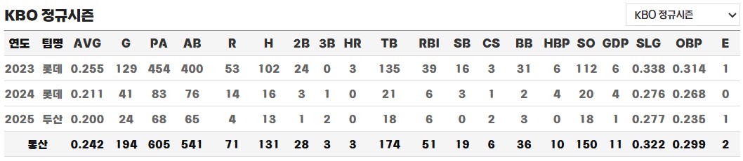 이적 후 김민석은 두산에서 새로운 기회를 잡았지만, 2025년 시즌 초반 역시 반등의 기미를 보이지 못했습니다. 24경기 출전, 타율 0.200의 성적에 그치며 여전히 1군에서 확실한 존재감을 발휘하지 못하고 있으며, 팀 역시 하위권에 머무르는 중입니다. 여러모로 타격 기술은 갖췄지만 파워, 수비, 선구안 등 핵심 툴에서 부족한 점이 많아 루이스 아라에즈나 토니 그윈처럼 성공적인 교타자 유형으로 성장하기 위해서는 상당한 보완이 요구됩니다.