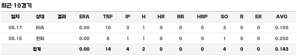 3일 뒤인 5월 17일, 그는 광주에서 열린 KIA 타이거즈와의 더블헤더 2차전에도 출전했습니다. 이날 경기에서는 선발 홍민규가 3.2이닝만에 내려간 이후 4회부터 등판해, 무려 3이닝을 소화하는 멀티 이닝 피칭을 선보였습니다. 그는 3이닝 동안 단 1개의 안타만을 허용하고, 3개의 탈삼진을 잡아내며 사사구 없이 무실점 투구를 기록했습니다. 이로써 그는 데뷔 이후 처음으로 연속 이닝을 책임지는 피칭을 선보이며 가능성을 입증했습니다.
