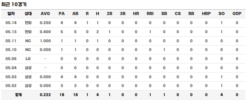5월 2일 삼성전에서 9번 타자, 3루수로 선발 출전하며 시즌 첫 1군 경기를 치렀고, 5월 11일 NC전에서는 프로 데뷔 첫 안타를 신고했습니다. 특히 5월 13일 한화전에서는 류현진을 상대로 10구 승부 끝에 안타를 뽑아내며 끈질긴 승부근성을 보여주었고, 수비에서의 아쉬운 장면이 있었음에도 연장전에서 결승타를 때려내며 팀 승리를 이끌었습니다. 이 경기에서 그는 데뷔 첫 2루타, 첫 타점, 첫 결승타를 동시에 기록하며 두산 팬들에게 깊은 인상을 남겼습니다.