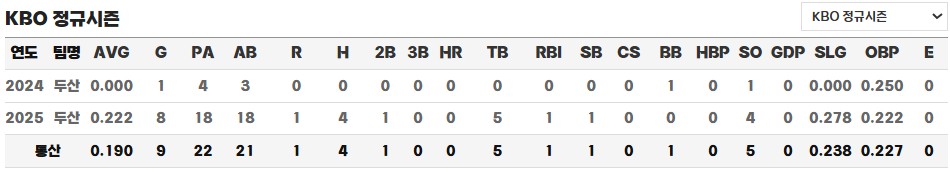 현재(2025년 5월 기준)는 허경민의 이적 공백을 메우며 주전 3루수로 점차 자리를 넓혀가고 있으며, 시즌 8경기 출장에 타율 0.222, 4안타, 1타점, 1득점을 기록 중입니다. 타격 성적은 아직 완성 단계는 아니지만, 강한 집중력과 안정된 수비력, 그리고 내야 전 포지션을 두루 소화할 수 있는 유틸리티성은 향후 성장 가능성을 크게 높여주고 있습니다. 두산 팬들 사이에선 “시간이 필요하지만 제대로 키우면 오래 볼 수 있는 선수”라는 기대감도 나오고 있습니다.