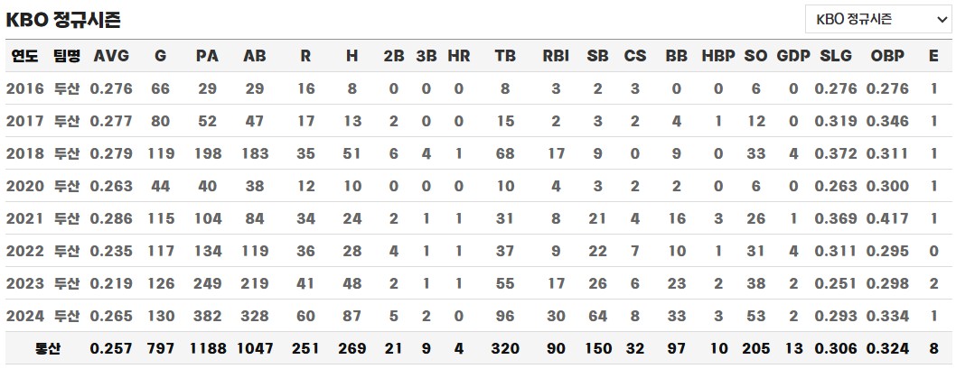그러나 타격에서는 여전히 한계가 있었습니다. 대학 시절 타율이 0.295였고, 프로에 와서도 타격에서는 부족함을 드러냈습니다. 통산 장타율은 겨우 3할 초반을 기록하며, 상대적으로 장타력이 부족했고, 선구안도 그리 뛰어나지 않아 타격에서 생산성을 높이는 데 어려움을 겪었습니다. 특히 대졸 후 군복무를 마친 뒤 30대에 접어들면서, 성장 가능성에 대한 기대는 점점 사라져 갔습니다. 타격 폼이 독특했지만 결국 이대형 선수의 하위호환 수준으로 평가받게 되었고, 이는 그가 주전으로 도약하기 어려운 이유로 작용했습니다.