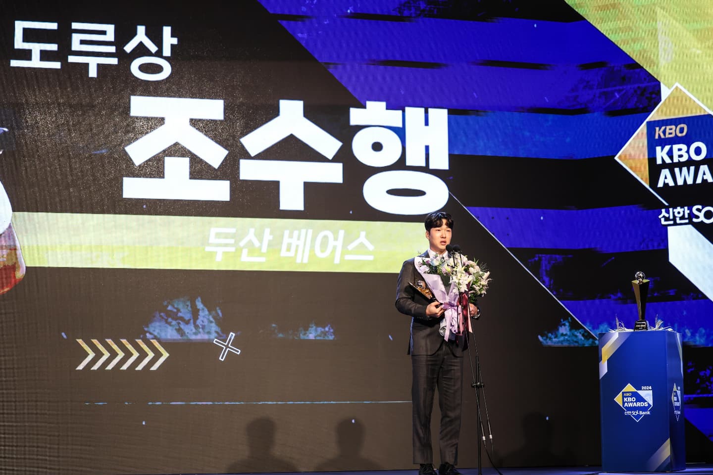 조수행은 프로야구 두산 베어스의 외야수이자 뛰어난 주루 능력을 자랑하는 선수입니다. 대학리그에서 90경기 92도루라는 경이적인 기록을 세우며 주루의 천재로 떠오른 그는, 2023년까지 총 109도루를 기록하며 그야말로 '주루왕'의 면모를 뽐냈습니다. 특히 2024년에는 64도루를 기록하며 도루왕에 등극, 여전히 빠른 발로 팀에 중요한 역할을 하고 있습니다.