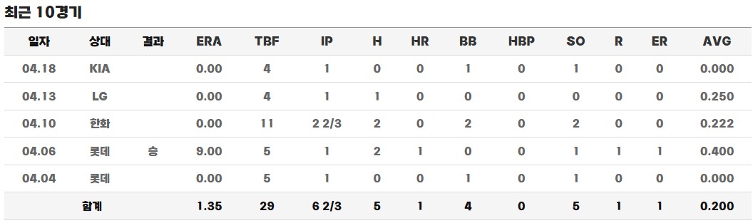 정규 시즌에서도 그는 점진적으로 출전 기회를 늘려가고 있습니다. 4월 5일 롯데 자이언츠와의 경기에서 9회 말에 등판하며 정식 데뷔전을 치렀고, 삼진 하나와 볼넷 하나를 기록하며 무실점으로 이닝을 마무리했습니다. 4월 10일 한화전에서는 팀이 큰 점수차로 끌려가는 상황에서 2⅔이닝 동안 2탈삼진 무실점으로 패전처리 역할을 성공적으로 수행했고, 이날 등판한 모든 투수들 중 가장 인상적인 피칭을 보여주며 존재감을 드러냈습니다. 이어 4월 13일 LG전과 4월 18일 경기에서도 팀이 앞서 있는 상황에서 마운드에 올라 각각 1이닝 무실점 투구를 이어가며 평균자책점을 1.35까지 낮췄습니다.