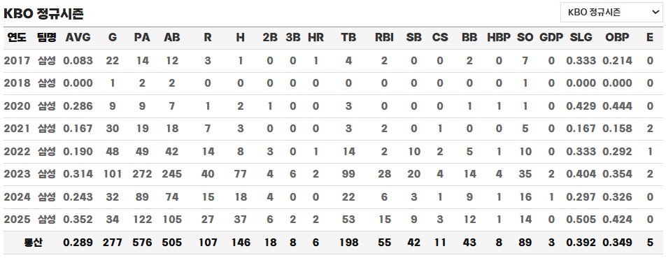 2025.03.30 - [야구김감독] - 김영웅 프로필|삼성라이온즈|나이|고향|연봉|성적|계약금|야구