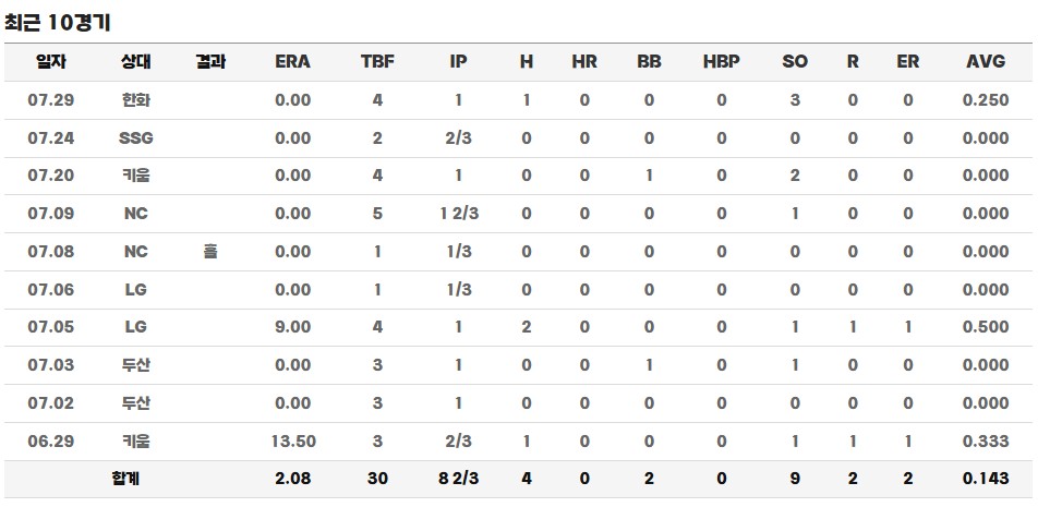 그러나 이후 불펜에서도 들쭉날쭉한 모습을 보이며, 평균자책점이 11점을 넘는 등 성적 면에서는 아쉬움이 컸습니다. 특히 피홈런 수치가 높아 20이닝도 채 되지 않는 상황에서 8개의 홈런을 허용했고, 추격조나 패전처리조로 기용되며 입지를 다지지 못했습니다. 그럼에도 좌완이라는 희소성과 수비진의 도움 덕분에 1군 엔트리에서 완전히 빠지지는 않았습니다.