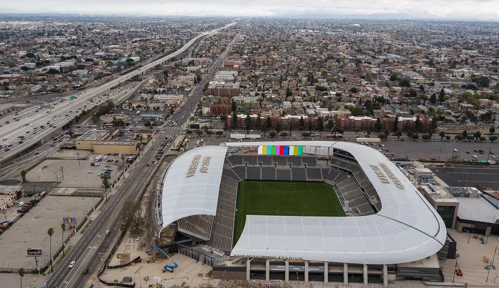경기장 디자인은 로스앤젤레스의 현대적인 감성과 축구 문화가 어우러져 있으며, 밤에 조명이 들어온 경기장의 전경은 매우 인상적입니다.