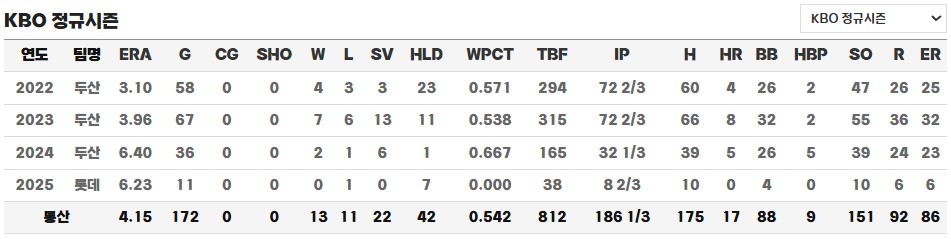 하지만 2022년부터 2시즌 연속 이어진 혹사로 인해 부상이 누적되었고, 2023시즌 후반기에는 마무리 투수로 보직을 전환했으나 블론세이브가 급증하면서 불안한 모습을 보였습니다. 특히 2024시즌에는 투구 내용이 급격히 무너지며 팬들의 비판이 이어졌고, 한계를 드러내기 시작했습니다. 여기에 대표팀 출전으로 누적된 피로가 팔에 무리를 주었고, 본인의 부족한 자기관리도 문제로 지적되었습니다.