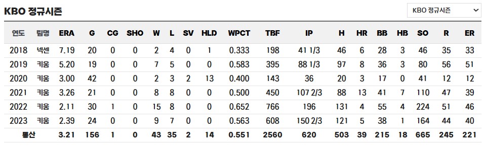 2017년에는 KBO 리그 키움 히어로즈(당시 넥센 히어로즈)와 역대급 신인 계약금인 6억 원에 계약하며 프로에 입문했습니다. 데뷔 후 성장통을 겪기도 했지만, 2022년 시즌을 기점으로 진정한 에이스로 거듭나며 리그 최정상급 투수로 올라섰습니다. 이 시즌 그는 평균자책점, 이닝, 탈삼진, WHIP, QS 부문에서 모두 1위를 기록하며, 명실상부한 ‘KBO 최고의 투수’로 불릴 만한 압도적인 성과를 보여주었습니다. 224개의 탈삼진은 토종 투수 최다 기록이었고, 탈삼진 능력뿐 아니라 이닝 소화 능력, 경기 운영 능력까지 갖춘 만능형 투수로 자리매김했습니다.