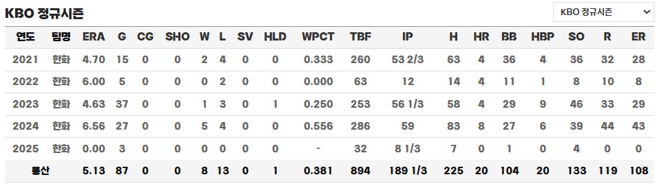 2024년 시즌에는 선발과 롱 릴리프를 병행하며 27경기에 출전, 5승 4패 평균자책점 6.56을 기록했습니다. 전반기에는 비교적 좋은 흐름을 보이며 승수를 쌓기도 했지만, 후반기 들어서는 경기당 5이닝도 채우지 못하는 상황이 반복되었습니다. 불안정한 제구와 멘탈 흔들림이 다시 고개를 들었고, 결국 선발보다는 불펜이 더 적합하다는 평가가 주를 이루게 되었습니다.