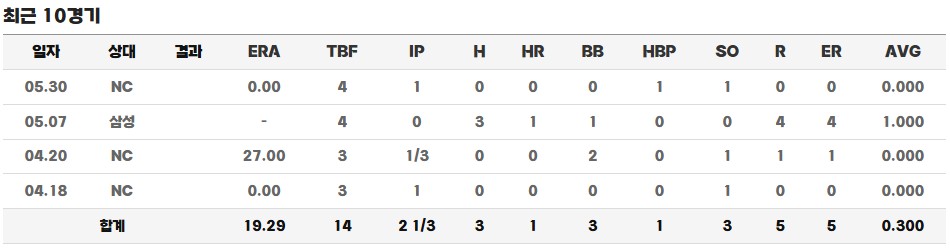 이후 5월 14일에 다시 1군에서 말소되었지만, 5월 28일 김종수의 말소로 공백이 생기면서 콜업되어 재차 기회를 받게 되었습니다. 5월 30일 NC전에서는 9회말 등판해 한 타자에게 사사구를 허용했지만 무실점으로 이닝을 마무리하며 깔끔한 투구를 선보였습니다. 특히 박민우, 권희동 같은 까다로운 타자들을 뜬공 처리한 데 이어, 데이비슨에게는 삼진까지 잡아내는 인상적인 피칭을 보여주며 자신의 가능성을 다시 한번 입증했습니다. 다만 일부 투구에서 제구가 흔들리는 모습도 있었기에, 여전히 안정적인 제구력 확보는 과제로 남아 있습니다.