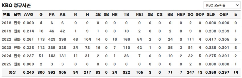 하지만 그 이후의 시간은 순탄치 않았습니다. 2024시즌 김인환은 130타수에서 고작 1개의 홈런을 기록하며 OPS 0.580, WAR -1.22라는 매우 저조한 성적을 기록했습니다. 공격은 물론 수비, 주루에서도 기대 이하의 모습을 보였고, 특히 1루수 수비에서는 포구 능력 외에는 부족한 부분이 많아 실망을 안겼습니다. 외야로 포지션을 변경한 시도도 있었지만, 느린 발과 부족한 타구 판단력으로 인해 오히려 수비에서 더 큰 약점이 드러났습니다. 그 결과 그는 한화 팬들 사이에서 2024시즌을 망친 주요 원인 중 하나로 꼽히게 되었습니다.