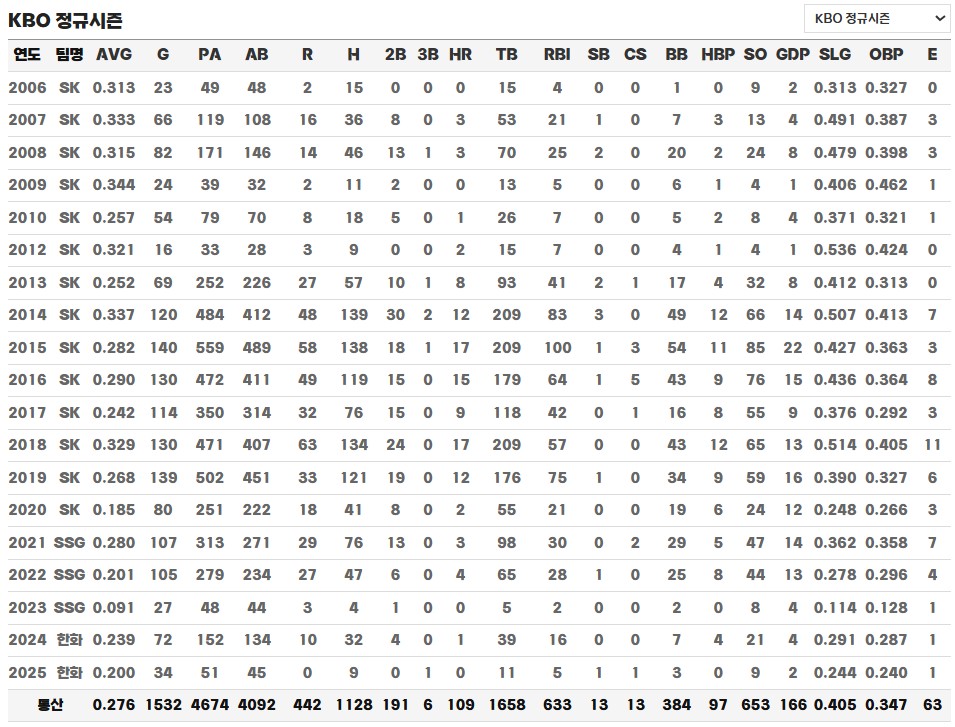 2018 시즌에는 다시금 반등에 성공하며 타격과 수비에서 준수한 활약을 펼쳤고, 주장으로서 팀을 이끌며 SK 와이번스가 한국시리즈에서 우승하는 데 큰 기여를 했습니다. 시즌 후에는 4년 69억 원 규모의 대형 FA 계약을 체결하며 프랜차이즈 스타로서의 입지를 확고히 했습니다. 그러나 그 시점을 기점으로 에이징 커브가 본격화되며 타격과 수비 모두에서 급격한 하락세를 보이게 되었고, 팬들로부터 ‘먹튀’라는 비판을 받기 시작했습니다.
