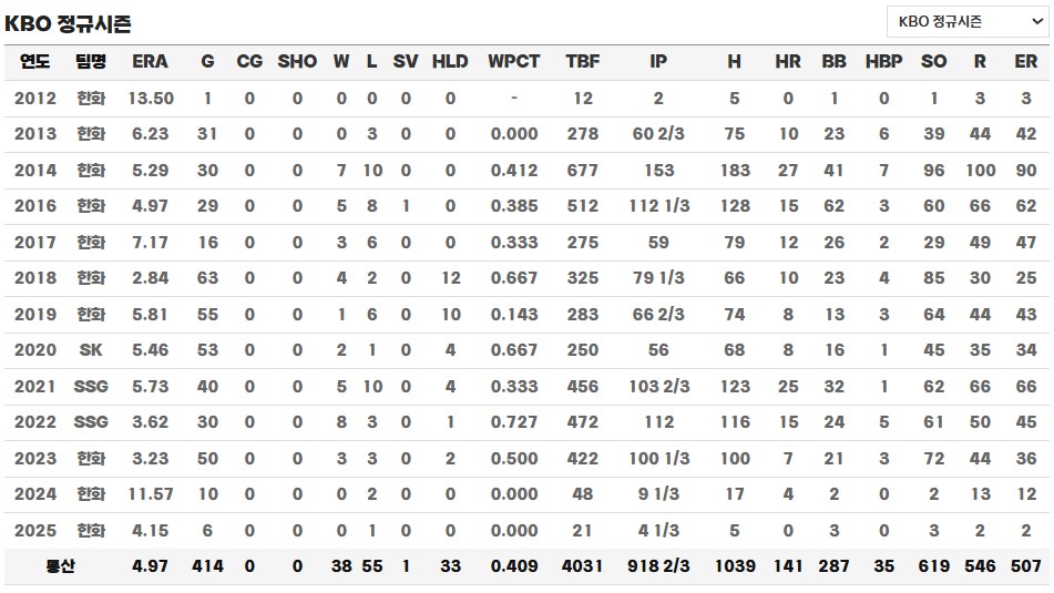 2010년 한화 이글스의 큰 기대 속에 입단한 이태양은, 초창기부터 선발과 불펜을 오가며 팀의 마운드에 힘을 보탰습니다. 그러나 2015년 김성근 감독 시절 극심한 혹사 끝에 토미 존 수술을 받았고, 이후 구속이 한때 평균 139km/h까지 떨어지는 등 힘든 시간을 겪기도 했습니다. 수술 직후인 2016년에도 실전 재활이라는 명목으로 급하게 복귀하며 몸이 제대로 회복되지 않은 상태에서 시즌을 소화해야 했고, 이러한 무리한 운영은 결국 2017년 부진과 구속 저하로 이어졌습니다. 평균자책점 7점대의 참담한 성적을 기록하며 커리어 최악의 시즌을 보내야 했습니다.