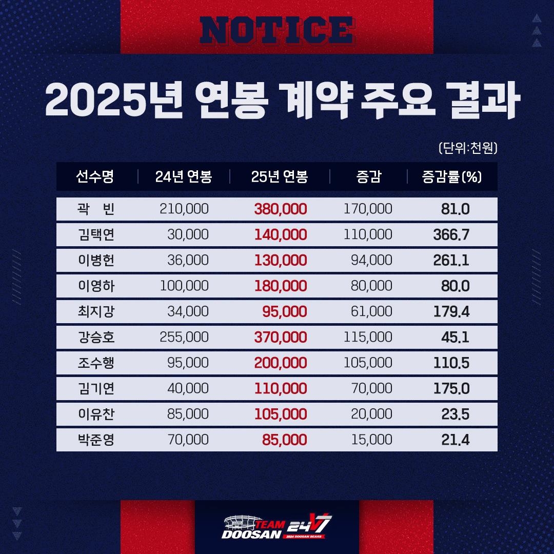 2025년 프로야구 두산 베어스 연봉 협상 완료|인상|삭감|두산|계약