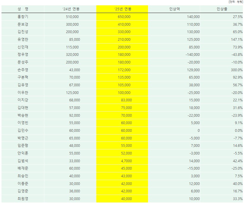 2024 연봉 5억1천만원 / 2025년 연봉 6억5천만원 / 증감율 27.5%