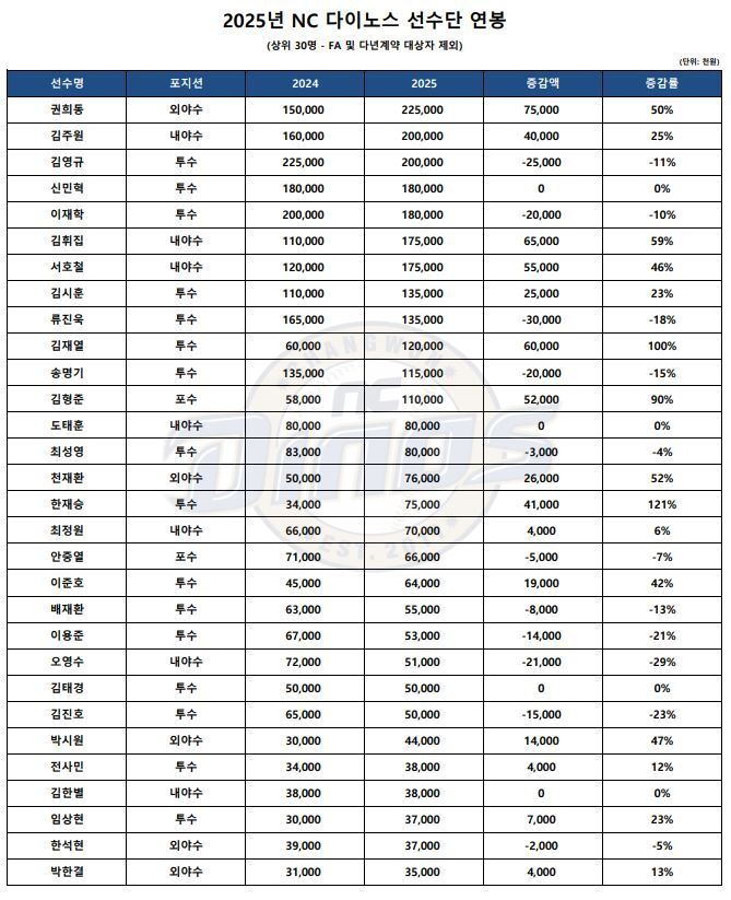 2025년 프로야구 NC 다이노스 연봉 협상 완료|인상|삭감|엔씨|계약