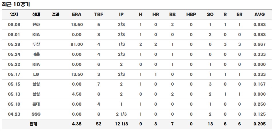 하지만 4월 중순 이후부터는 조금씩 안정을 찾아가기 시작합니다. 4월 19일 키움과의 경기에서는 9회 말 등판해 삼자범퇴 KKK를 기록하며 구위를 입증했고, 삼성과의 맞대결에서도 꾸준히 등판 기회를 부여받으며 경험을 쌓았습니다. 특히 5월 15일 경기에서는 조기 강판된 고영표를 이어받아 2이닝 동안 무실점으로 호투하며 좋은 인상을 남겼습니다.