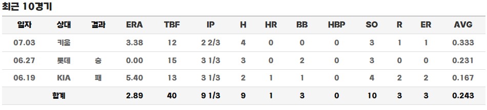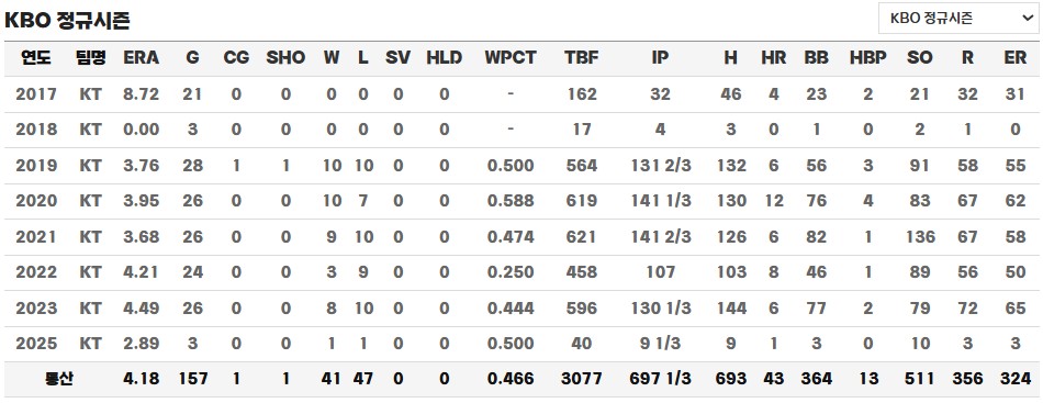 이후에도 6월 8일 롯데전에서는 6⅔이닝 2실점으로 자신의 첫 승리를 따냈고, 6월 27일, 7월 3일, 7월 16일 등 꾸준히 퀄리티 있는 선발 피칭을 이어가며 시즌 중반부터는 KT 토종 선발의 중심으로 자리잡았습니다. 특히 롯데 자이언츠를 상대로만 시즌 3승을 거두며 ‘롯데 킬러’라는 별칭도 얻었습니다.