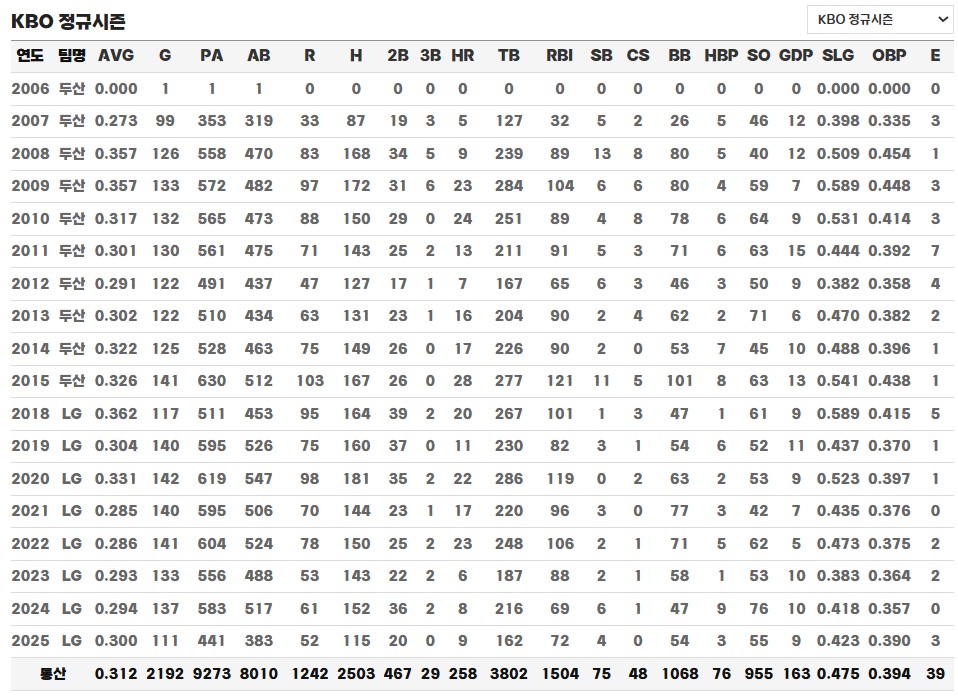2025년은 김현수에게 매우 중요한 해입니다. LG 트윈스와의 두 번째 FA 계약이 만료되는 해이자, 옵션 달성 여부에 따라 계약 연장이 결정되는 해이기도 합니다. 팀의 1위 수성과 더불어 다시 한 번 한국시리즈 우승에 도전하는 시점에서, 김현수의 활약은 팀의 운명과도 직결된다고 할 수 있습니다. 타격 기계로 불리던 시절만큼은 아니지만, 여전히 3할 타율과 중심타선에서의 꾸준한 생산력을 유지하며 그는 KBO 리그 최고의 베테랑 중 한 명으로 남아 있습니다.