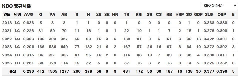 2025시즌 현재까지는 대타와 지명타자로 자주 출전하며 38경기 114타수 32안타, 타율 0.281을 기록하고 있습니다. 팀의 선두 질주에 알찬 기여를 하며, 여전히 LG 트윈스 외야진의 중요한 퍼즐 조각으로 활약 중입니다. 과거의 저평가를 딛고 끊임없는 노력으로 자신의 가치를 증명해낸 문성주 선수는 앞으로도 팀과 팬들에게 꾸준한 믿음을 주는 존재로 남을 것입니다.