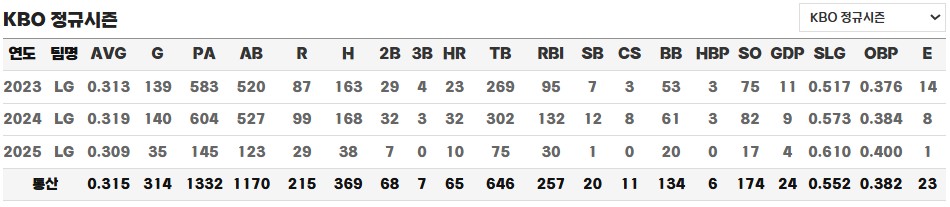 2025시즌에도 그는 35경기에 출전해 타율 .309, 38안타, 10홈런, 30타점을 기록하며 팀의 선두 질주에 결정적인 역할을 수행하고 있습니다. LG 트윈스 역사상 가장 성공적인 외국인 타자로서, 그의 활약은 앞으로도 팬들과 구단 모두에게 큰 기대감을 안겨주고 있습니다.