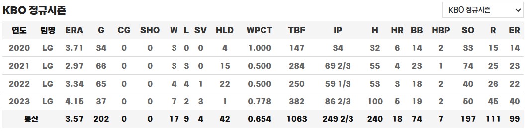 2020년 데뷔 시즌에는 34경기에서 평균자책점 3.71을 기록했고, 2021년에는 팀 내 불펜에서 가장 많은 이닝을 소화하며 10개 이상의 홀드를 기록, 불펜 핵심 자원으로 자리매김했습니다. 2022년에는 개인 첫 20홀드를 돌파하며 LG 불펜진의 중심으로 활약했지만, 플레이오프에서 아쉬운 장면도 남겼습니다. 2023년 시즌 초반에는 마무리로 기용됐으나 5번의 블론 세이브로 2군에 내려갔고, 이후 선발로 전환해 팀이 선발진 붕괴 위기에 처했을 때 9승 1패라는 놀라운 성과를 내며 LG의 반등을 이끌었습니다. 한국시리즈에서도 눈에 띄는 활약을 펼쳤습니다. 그는 평균 구속 146.8km/h의 포심과 슬라이더, 커브, 포크볼을 주로 사용하는 정통파 우완 투수입니다. 커브와 포크볼은 선발 전향 후 큰 무기가 되었고, 포심은 KBO 구종가치 상위권에 들 만큼 위력적입니다.