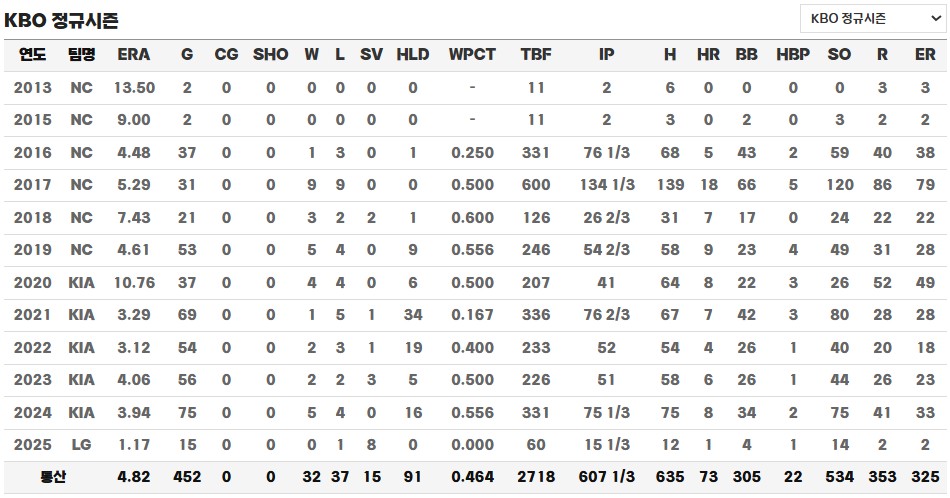2019년 8월에는 NC 다이노스와 KIA 타이거즈 간의 2:2 트레이드를 통해 김태진과 함께 KIA로 이적하게 되었고, 이적 후 본격적으로 커리어가 꽃을 피우기 시작했습니다. 특히 2021년 시즌에는 완전히 각성한 불펜 투수로 활약하며 홀드왕을 차지했고, 경기 후반을 책임지는 필승조의 핵심으로 자리 잡으며 팀의 마운드를 안정시키는 데 큰 기여를 했습니다. 하지만 팀이 포스트시즌 탈락이 확실시된 이후에도 과도한 등판으로 혹사 논란에 휘말렸으며, 이로 인해 이듬해인 2022년에는 초반 부진과 팔꿈치 통증으로 1개월 이상 결장하는 등 어려움을 겪기도 했습니다. 그럼에도 시즌 후반에는 다시 좋은 피칭을 선보이며 재기에 성공했고, 시즌 종료 후 팔꿈치 뼛조각 제거술 및 골극 정리술을 받으며 본격적인 회복에 나섰습니다.