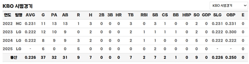 2025 시즌 현재까지도 상황은 크게 나아지지 않았습니다. 2군 퓨처스리그에서는 22경기에서 타율 0.257을 기록 중이고 2군 퓨처스리그에서는 22경기에 출전하여 타율 0.257을 기록하고 있으며, 안타는 9개에 그치고 있습니다. 타석 수 자체가 많지 않아서 평가하기엔 표본이 작지만, 2군에서는 그래도 타격 밸런스나 실전 감각에서 조금은 나아진 모습을 보여주고 있는 편입니다. 그러나 1군에서는 여전히 기회를 거의 얻지 못하고 있습니다. 2025 시즌 1군에서 기록한 성적은 9경기 5타석 무안타로, 공격에서는 전혀 존재감을 드러내지 못하고 있는 상황입니다. 대부분의 경기에서 대주자 역할로만 나서고 있으며, 경기 후반 대타나 대수비와의 교체 조합으로 잠깐 얼굴을 비추는 수준입니다.