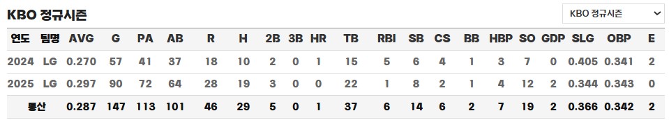 주루 센스에서 다소 아쉬운 모습을 보인 적도 있었지만, 타격과 수비에서 보인 발전 가능성은 분명합니다. 특히 데뷔 첫 해부터 기록해온 안정적인 타율과 OPS, 그리고 고교 시절부터 이어져 온 꾸준한 성적은 그가 단순한 대주자가 아닌, 선발 외야수로 성장할 수 있는 가능성을 지니고 있다는 증거입니다.