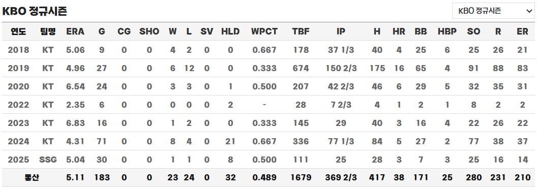 이후 그는 2024년 10월 31일, SSG 랜더스의 좌완 투수 오원석과 트레이드를 통해 새로운 팀으로 이적하게 됩니다. 트레이드 이후 맞이한 2025년 시즌에는 SSG 불펜의 핵심 자원으로 등판하며 30경기에서 25이닝을 소화했고, 1승 1패 8홀드 25탈삼진 ERA 5.04의 기록을 남기고 있습니다. 아직까지는 구위 회복과 이닝 관리를 조율 중이지만, 팀 내에서 여전히 중요한 역할을 맡고 있습니다.
