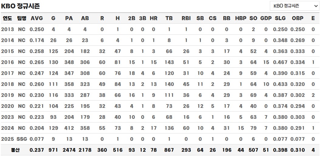 2024년 FA 자격을 얻었으나, 시즌 내내 기복이 심한 타격과 부진한 성적 탓에 시장의 반응은 차가웠습니다. 그러나 수비력만큼은 KBO 최고 수준이라는 평가와 함께 외야 전 포지션을 소화할 수 있는 유틸리티성이 주목받아, 여전히 가치는 남아 있었습니다. 장타력을 원하는 팀으로는 키움과 한화가 거론되었으나, 한화는 이미 외부 영입 한도를 채운 상태였고, 키움은 구체적인 움직임 없이 지켜보는 상황이었습니다. 결국 그는 원소속팀인 NC와 2년 최대 3억 원(계약금 5천만 원 포함)의 조건으로 재계약하며 팀에 잔류했습니다.