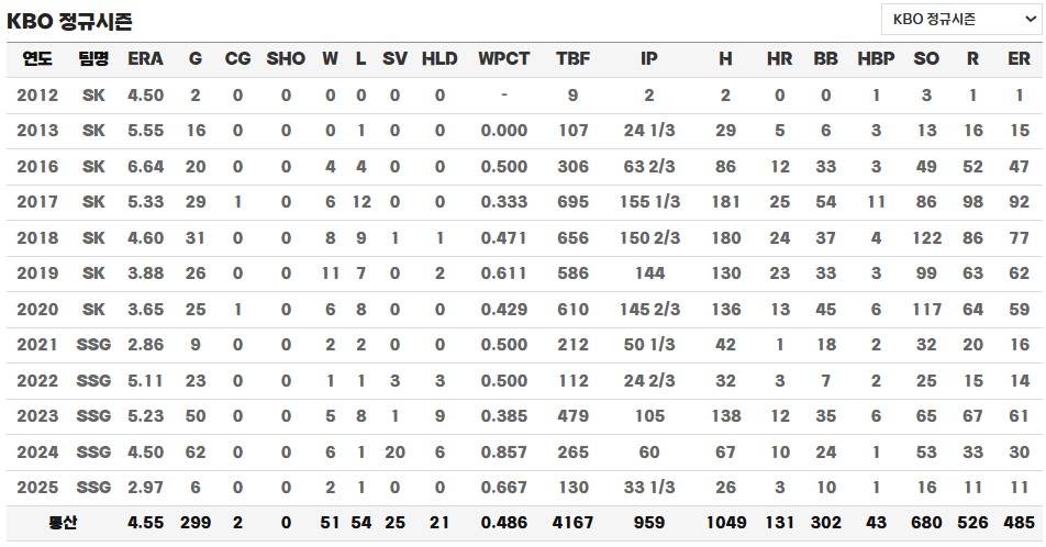 2025년 들어 다시 선발투수로 복귀한 그는, 이전의 다양한 구종들을 다시 장착하면서 더욱 노련한 완급 조절 능력을 보여주고 있습니다. 특히 같은 구종 내에서도 구속 차이를 두는 투구가 가능해지며, 메릴 켈리와 유사한 투구 패턴을 선보이고 있습니다. 2025년 시즌 현재까지 문승원은 6경기에 출전해 2승 1패, 평균자책점 2.97, 탈삼진 16개를 기록하며 SSG 랜더스 선발 로테이션의 한 축을 든든히 지키고 있습니다. 마운드에서의 경험과 구종 운영의 노련함이 돋보이며, 부상 회복 이후에도 충분히 1~2선발급 투수로 활약할 수 있는 가능성을 입증하고 있습니다.