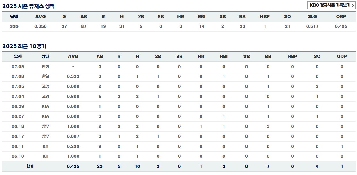 퓨처스리그에서는 4월 기준으로 타율 .357, 출루율 .514, 2도루를 기록하며 빠르게 적응하고 성장하는 모습을 보이고 있습니다. 시즌 중반까지 2군에서 37경기에 나서 87타석 31안타 3홈런 14타점 3도루를 기록하며 꾸준한 활약을 이어가고 있습니다.